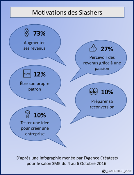 Le phénomène, associé au développement du statut de l’auto-entrepreneur (2008) – devenu micro entrepreneur – fait l’objet d’une infographie menée par l’Agence Créatests pour le Salon SME. En 2016, les slashers sont évalués à 4 millions en France. 70% sont devenus pluriactifs par choix.