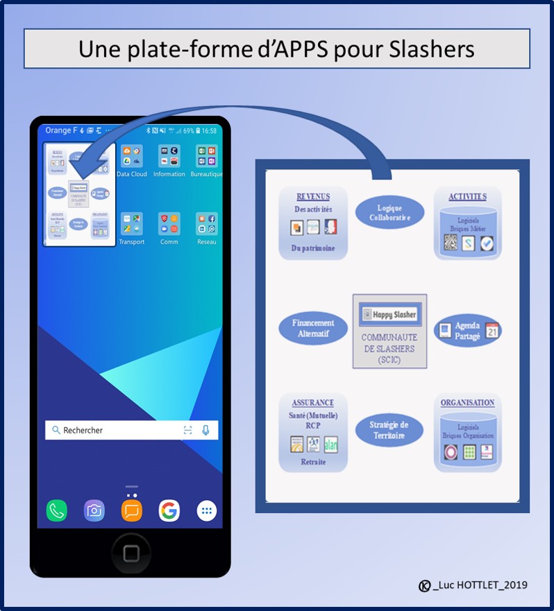 Le Pluriactif ou Slasher apparaît comme un travailleur mobile capable de s’insérer à tout moment dans des projets collaboratifs. Le système d’informations apparaît comme une plate-forme d’Apps. Tant pour le slasher que pour le groupe, ces Apps (applications, logiciels…), référencées et installées sur smartphone, portent :